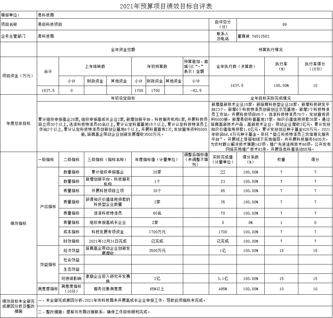 科技局2021年科技发展专项资金和工业园区技改补助资金使用满意度100%。